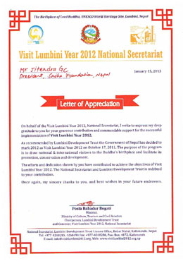 Letter of Appreciation received from Visit Lumbini year 2012 National Secretriate.
